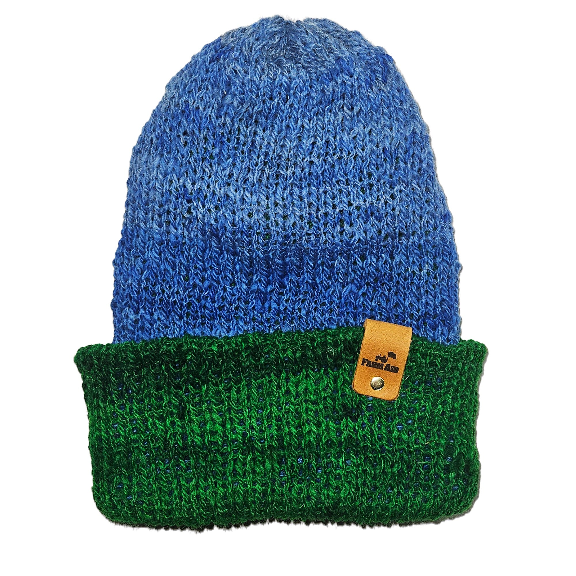 Get cozy with this hand-cranked double knit wool hat, made with love in Minnesota from sheep across the border in Wisconsin! We have a few color options — a natural gray, all blue, all green, blue with green brim, and green with blue brim. Pick your color before adding it to your cart.
